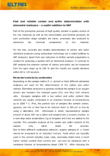 Part of the production process of high quality cement is quality control of the raw materials as well as the intermediate and finished products. At each production stage samples are taken, processed and analyzed to determine the chemical composition of the material. For the fast, accurate and reliable determination of carbon and sulfur elemental analyzers using combustion technology are a useful addition to XRF analyzers. Apart from size reduction no further sample preparation is needed for analyzing a sample with an elemental analyzer. In contrast to XRF analysis the element content of carbon and sulfur can be measured from the ppm range up to 100 % and the results are usually obtained within 60 to 120 seconds.