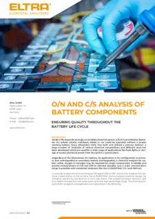Regardless of the dimensions of a battery, its application or its configuration as primary (not rechargeable) or secondary battery (rechargeable), a chemical analysis for carbon, sulfur, oxygen or nitrogen may be required for single components. A reliable and precise measurement of C/S and O/N in selected samples over a wide concentration range is possible with elemental analyzers like the ELEMENTRAC CS-i and ONH-p 2.